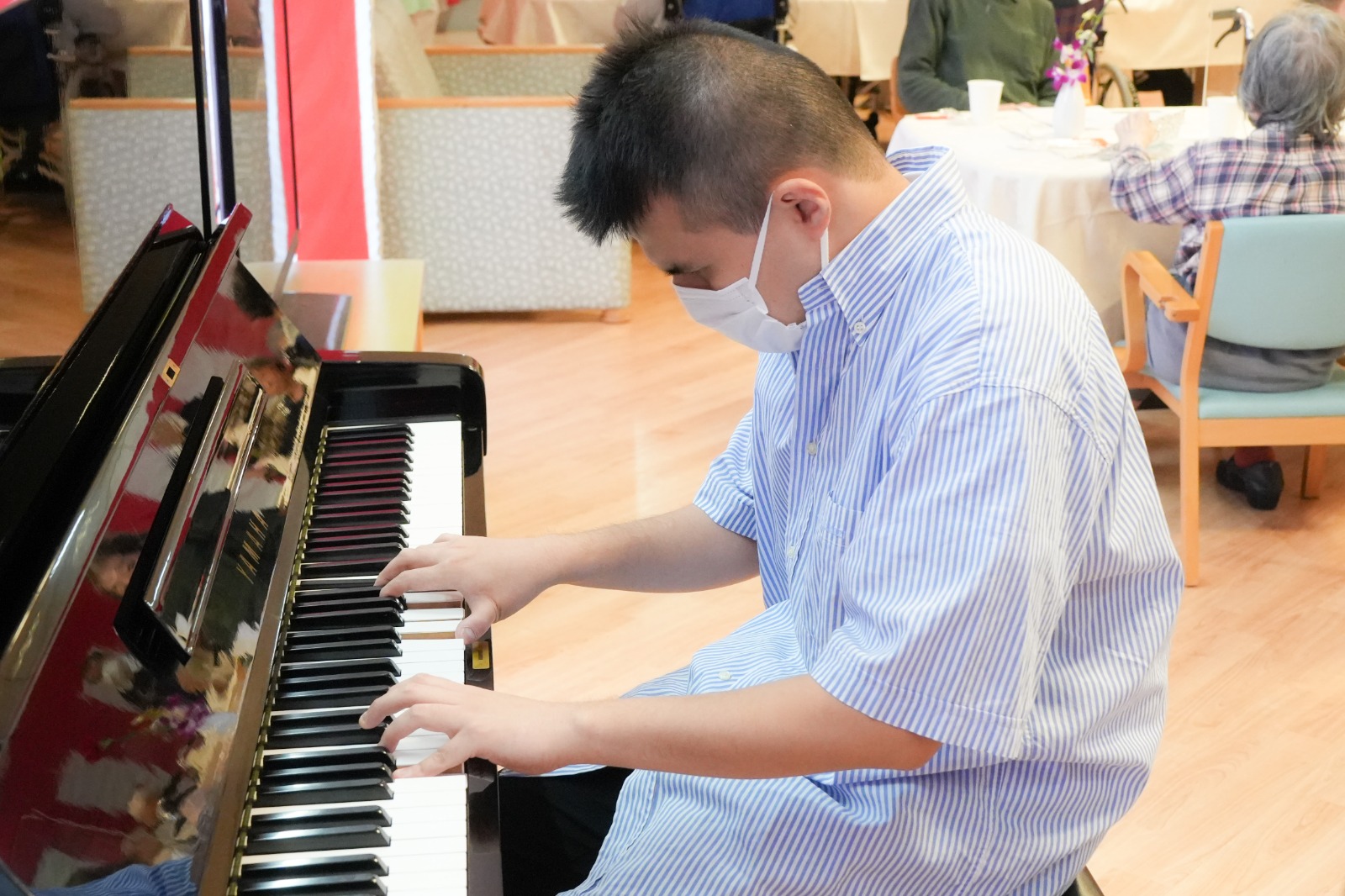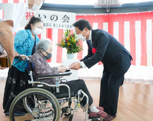 ルストホフ志木では、9月28日(日)に「敬老祝いの会」を開催させていただきました。今年は105歳の方をはじめ、99歳・白寿1名、88歳・米寿13名、77歳・喜寿3名の方々に、香川武文志木市長よりお祝いのお言葉と記念品が、西川理事長より花束が贈られました。表彰の後には、盲目のピアニストとして活躍されている千頭和 達(ちずわ とおる)様による演奏が披露されました。聴き馴染みのある曲の演奏の最後に「上を向いて歩こう」のメロディーが奏でられると、会場に集まった皆様はぞれぞれに口ずさんでおられました。式典終了後には、今回も厨房特製の「祝い膳」が振舞われ、特別な日の味覚を楽しんでいただけたことと思います。今年もさまざまな方々のご協力により、無事執り行うことができました。職員一同、心より感謝申し上げます。